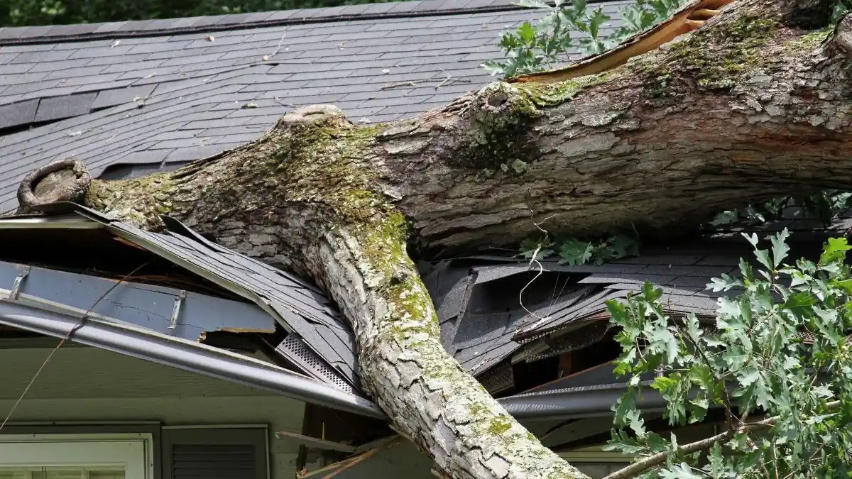 - Wind damage, downed branches, broken windows, and torn-off siding.